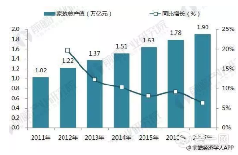图表2:2011-2017年中国家装行业产值变化(单位:万亿元,%)